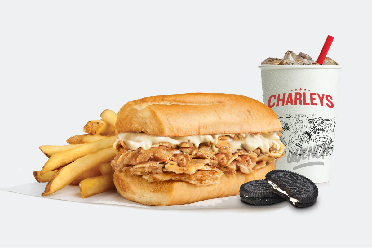 Charleys Chicken Cheesesteak Boxed Meal includes a chicken cheesesteak made with grilled all-white meat chicken, onions, and green peppers topped with melted American cheese and served on our signature toasted roll. Lettuce, tomato, and mayonnaise packets are provided on the side. Consider adding Miss Vickie's Chips, Dasani bottled water, and a Chocolate Chunk Cookie to complete your meal.