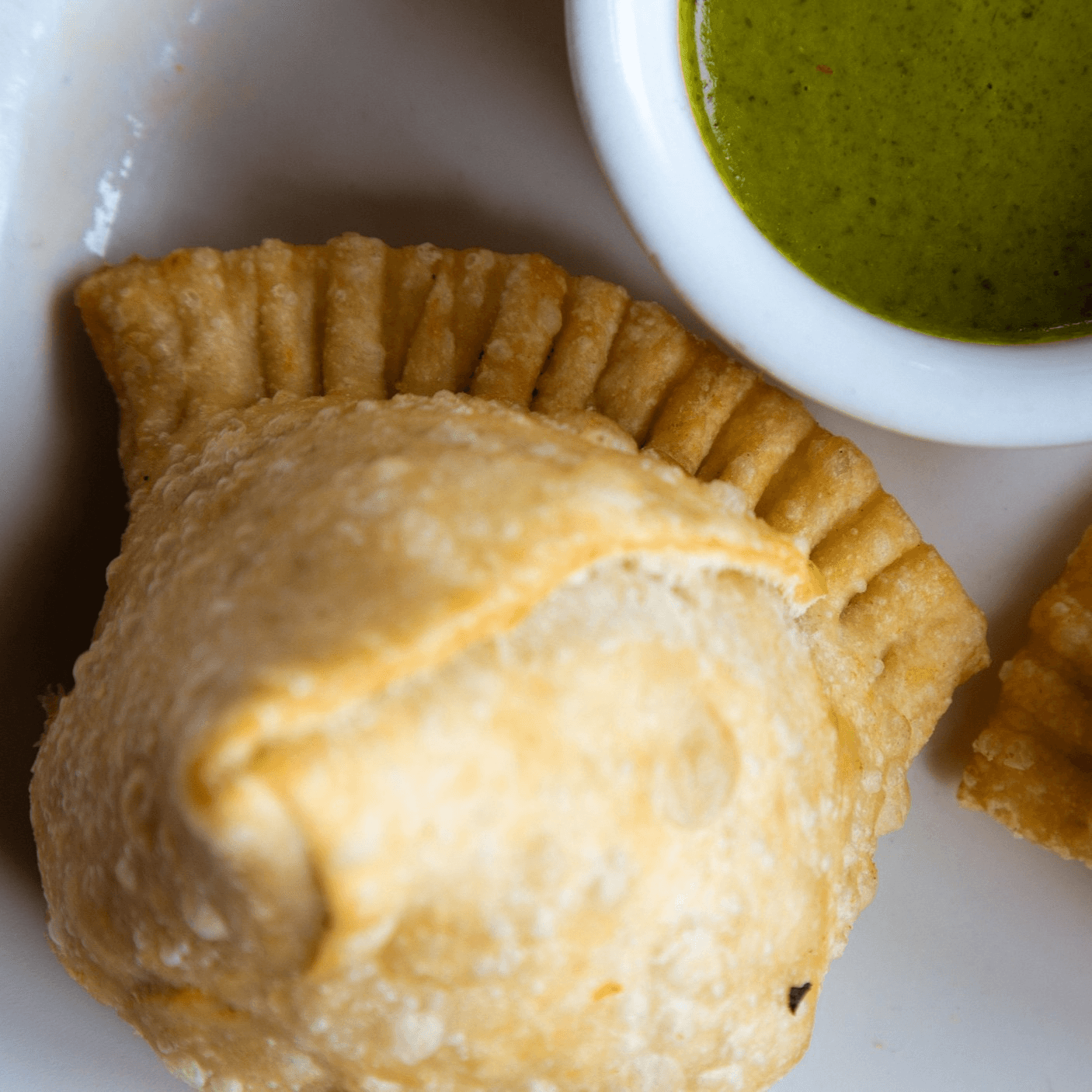 Vegetarian, vegan. Homemade triangular pastries made of white flour stuffed with seasoned potatoes and peas, served with coriander chutney
