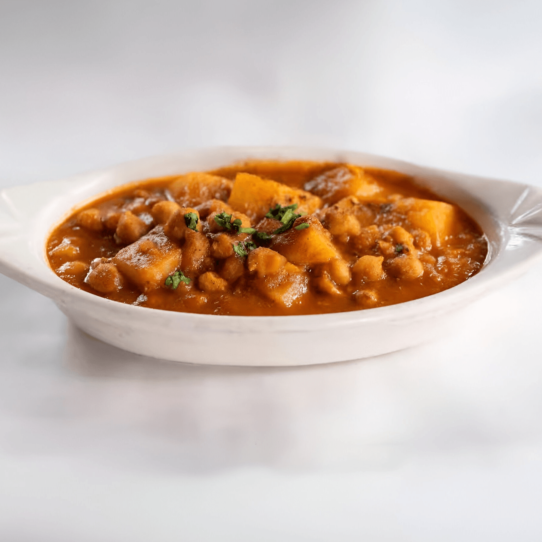 Gluten-free, vegetarian, vegan. Chickpeas cooked with potatoes & tomatoes in special curry sauce