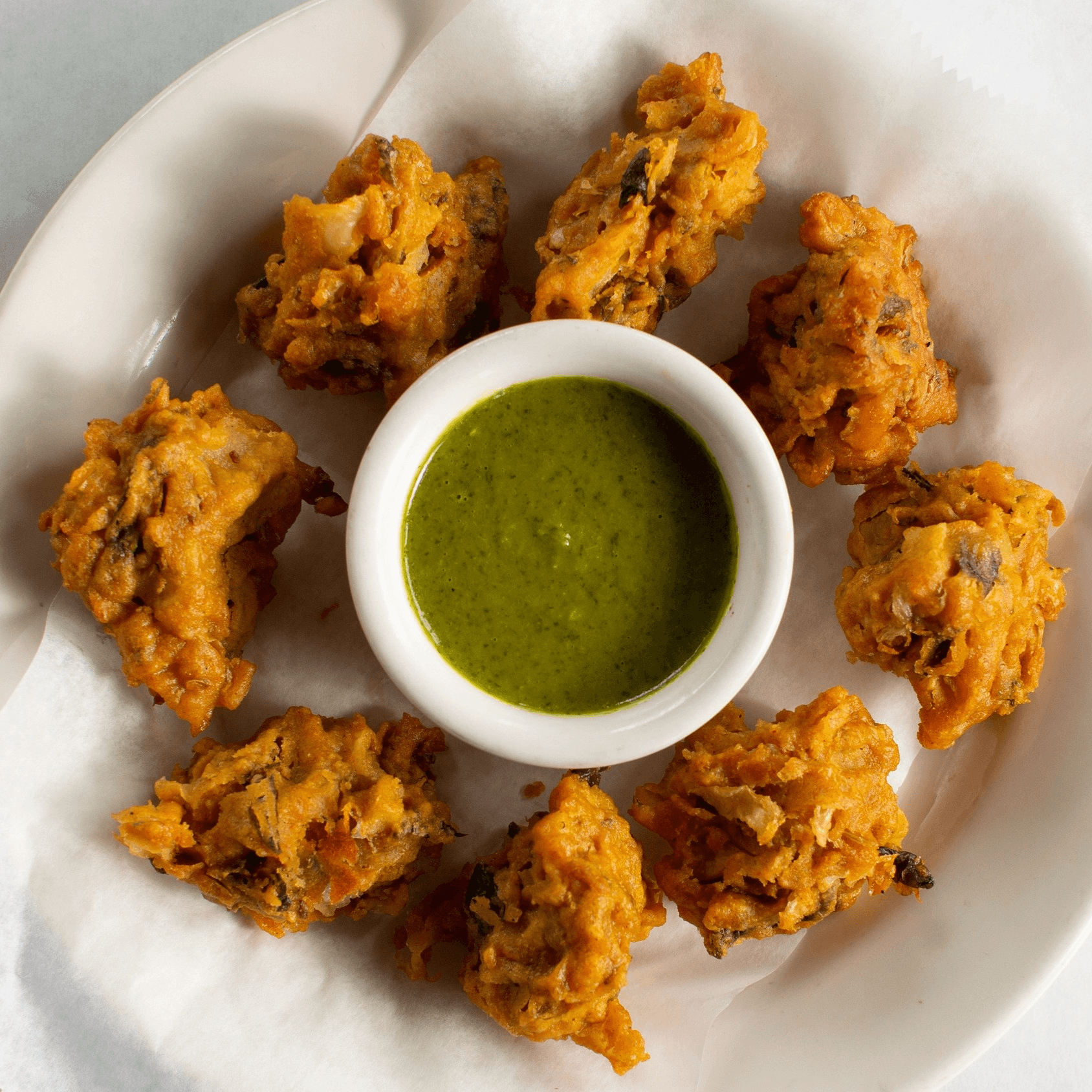 Gluten-free, vegetarian, vegan. 8 pakoras made of mixed vegetables battered in gram flour and ground beans fried and served with coriander chutney