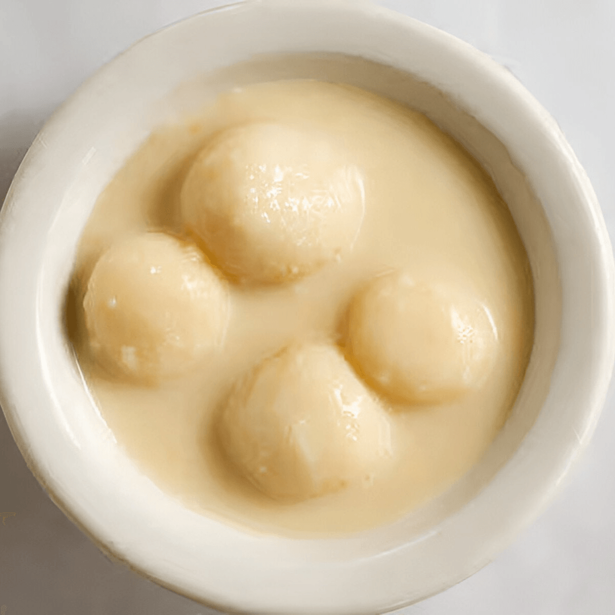 Gluten-free, vegetarian. Homemade cheese balls soaked in a sweet cream sauce
