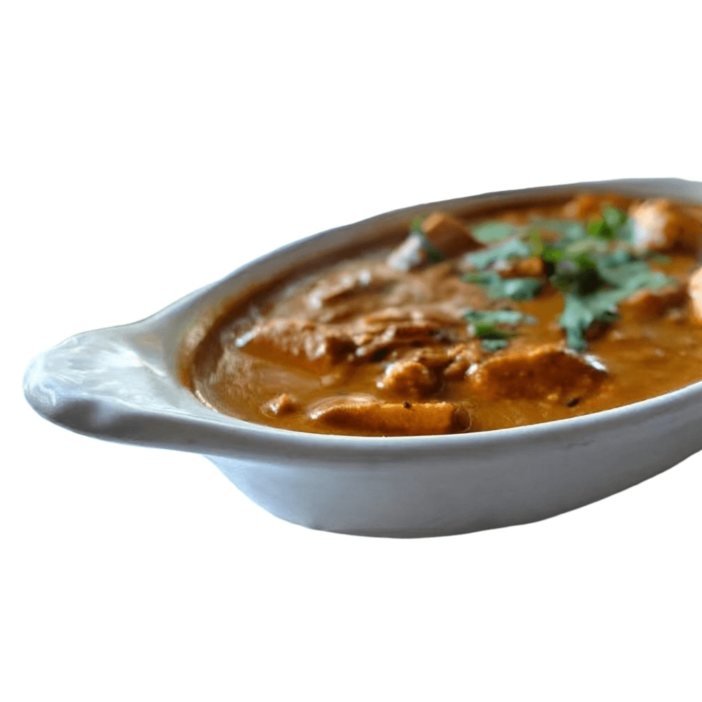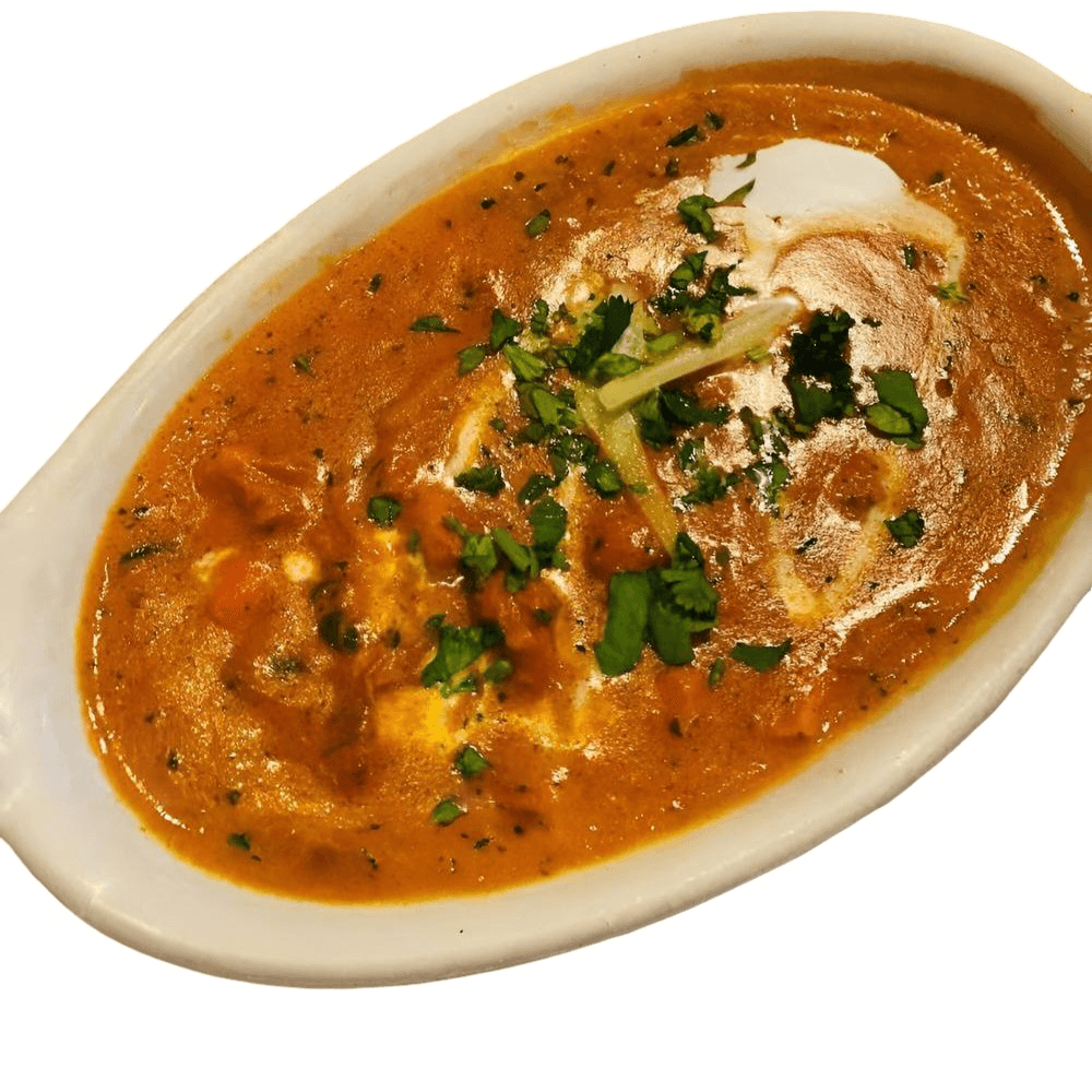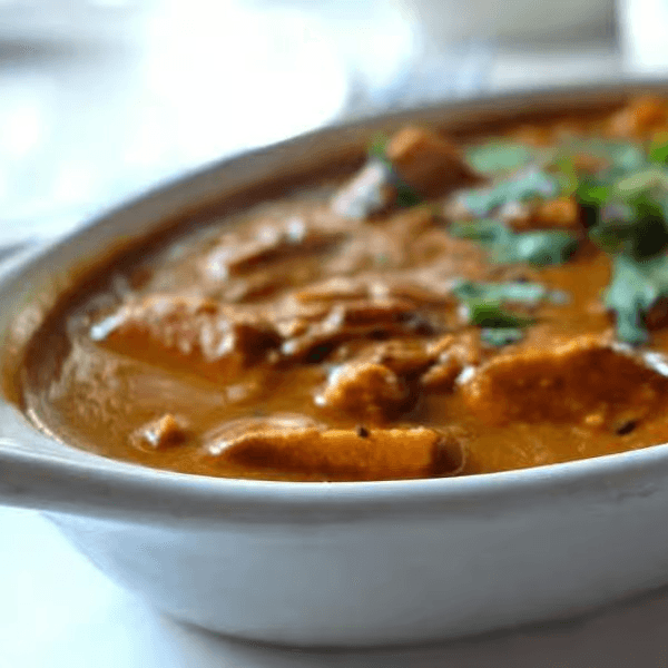 Gluten-free, contains nuts. Finely cut Tandoori Chicken Tikka sautéed in butter and cooked with blended tomatoes in cream sauce and finely grated cashews
