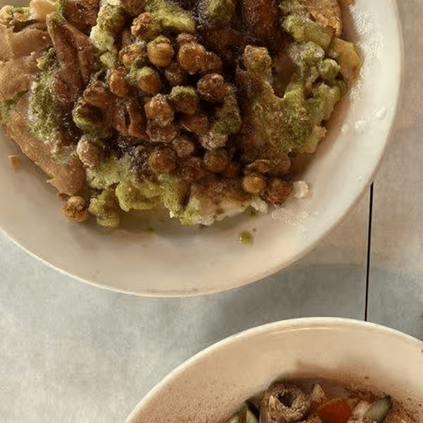 Flat bread stuffed with mildly-seasoned chopped lamb, peas, eggs, chopped onions and green peppers, then baked