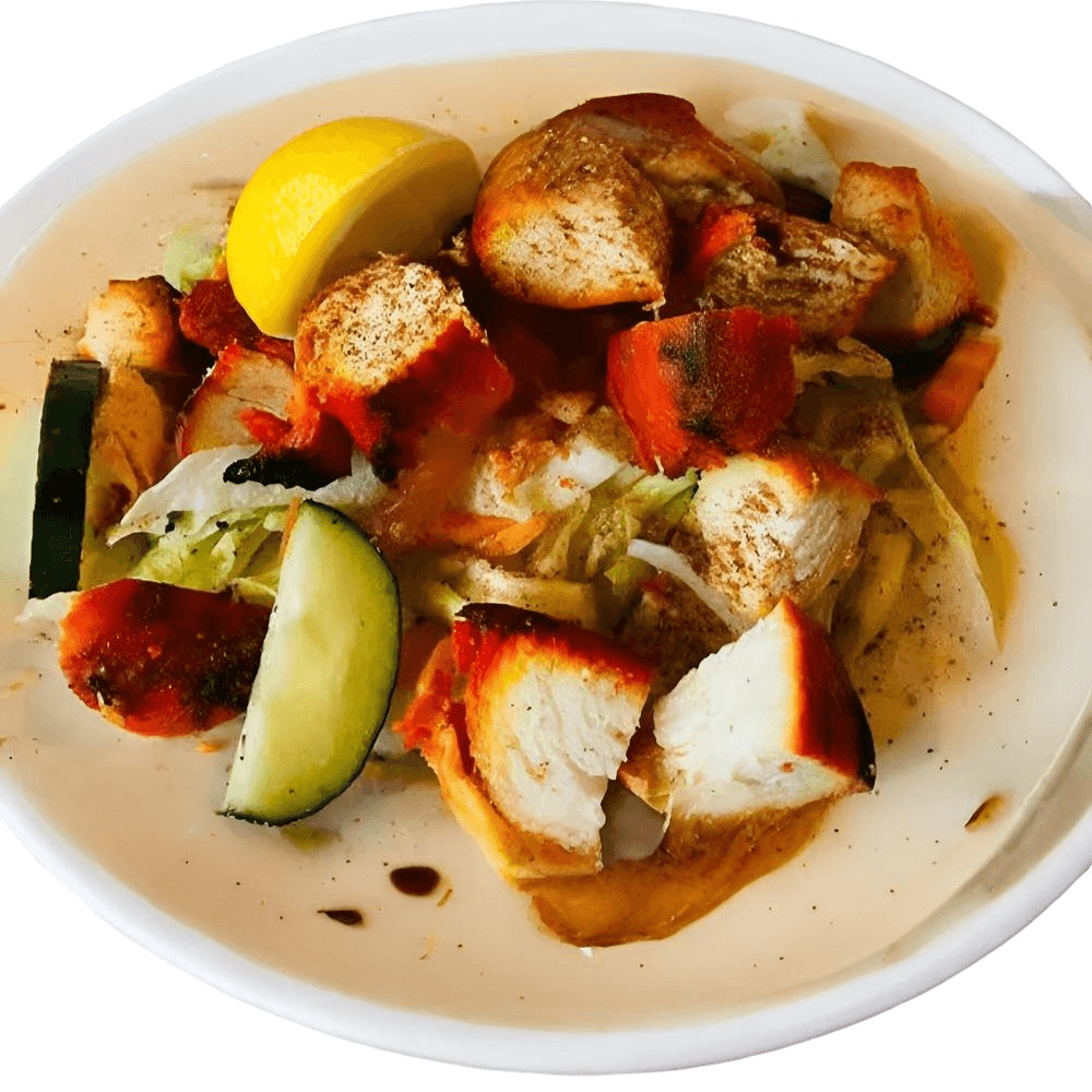 Gluten-free. Fresh lettuce with onions, tomatoes, cucumbers and seasonings, topped with chicken tikka and fresh cut lemon