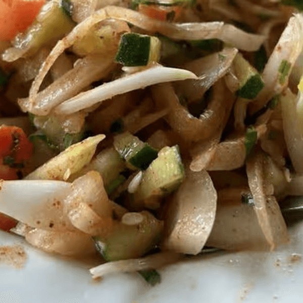 Gluten-free, vegetarian, vegan. Fresh cut onion, tomatoes, cilantro and cucumbers with seasonings