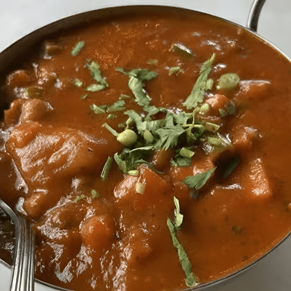 Gluten-free. Tender cubes of meat with tomatoes, potatoes and vinegar cooked in our special spicy curry sauce