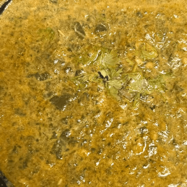 Gluten-free, vegetarian. Chickpeas cooked with tender leafy greens cooked in mild spices, finished with cream