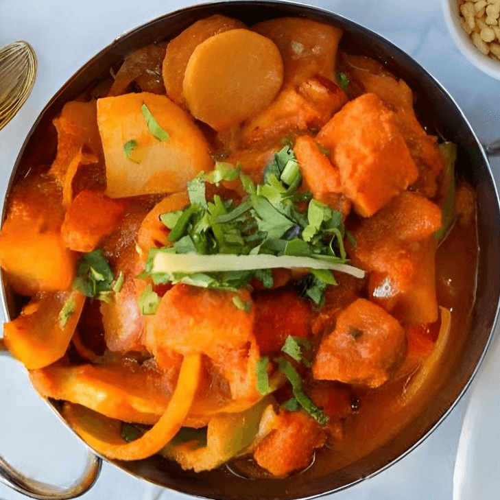 Gluten-free, vegetarian, vegan. Assorted vegetables cooked with spices in a sweet and sour sauce