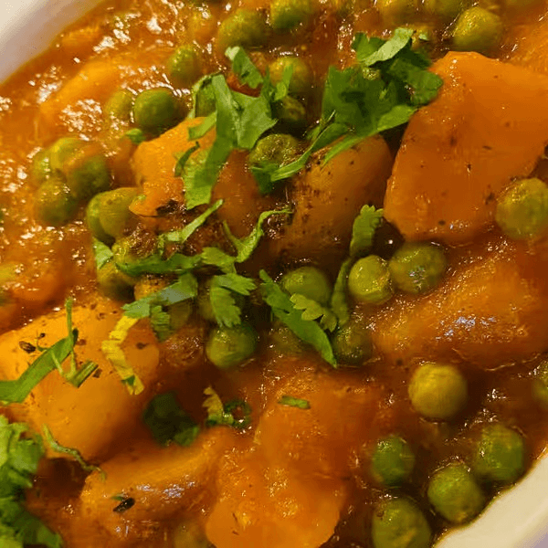 Gluten-free, vegetarian. Fresh potatoes cooked with peas and tomatoes in a special sauce