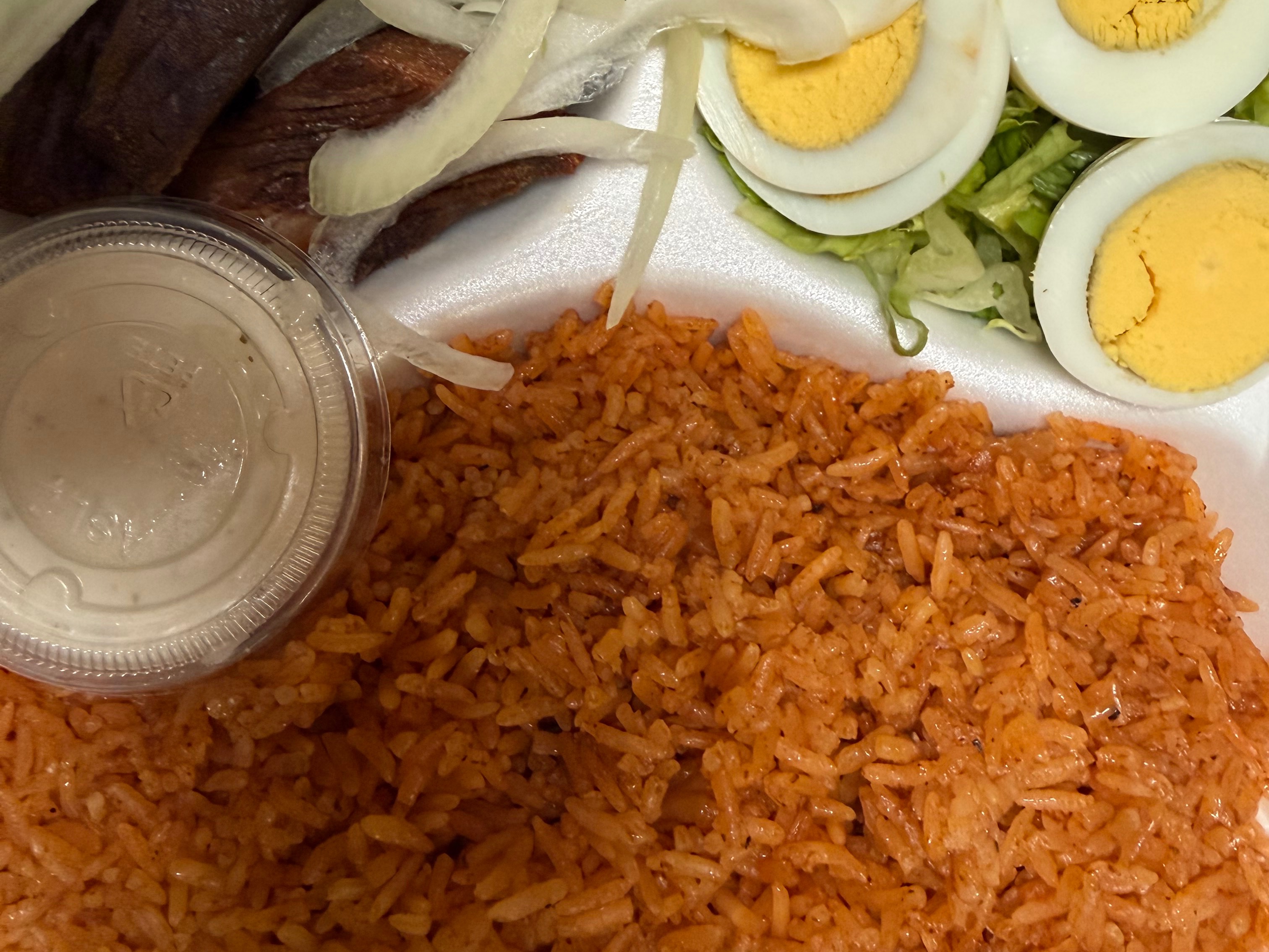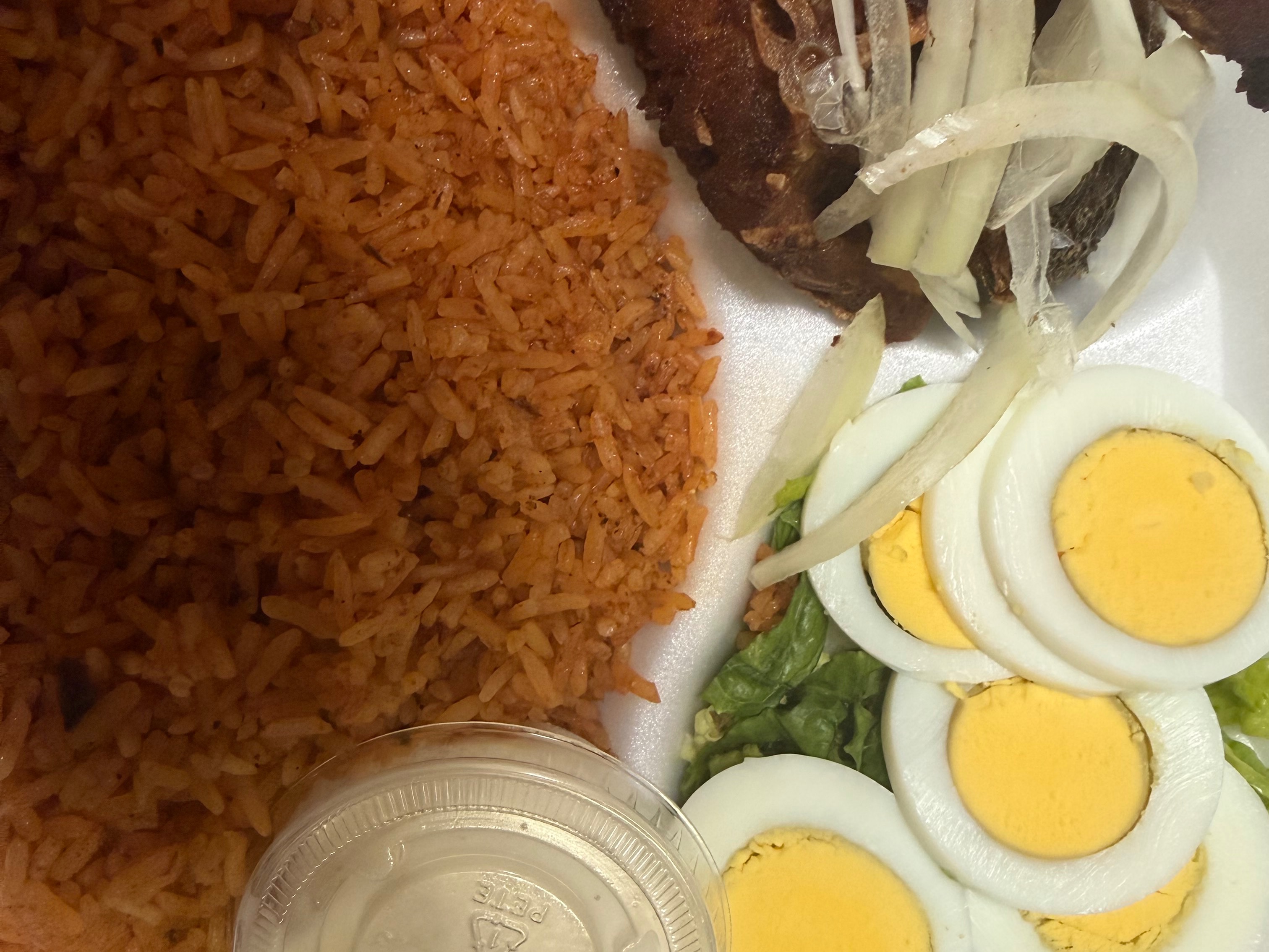 Your choice of (2) Ga or Fante Kenkey Eggs, Shrimp, Chofi , Kabobs, Sardines, Fried Red Snapper, Shito , Red Chili Pepper Sauce