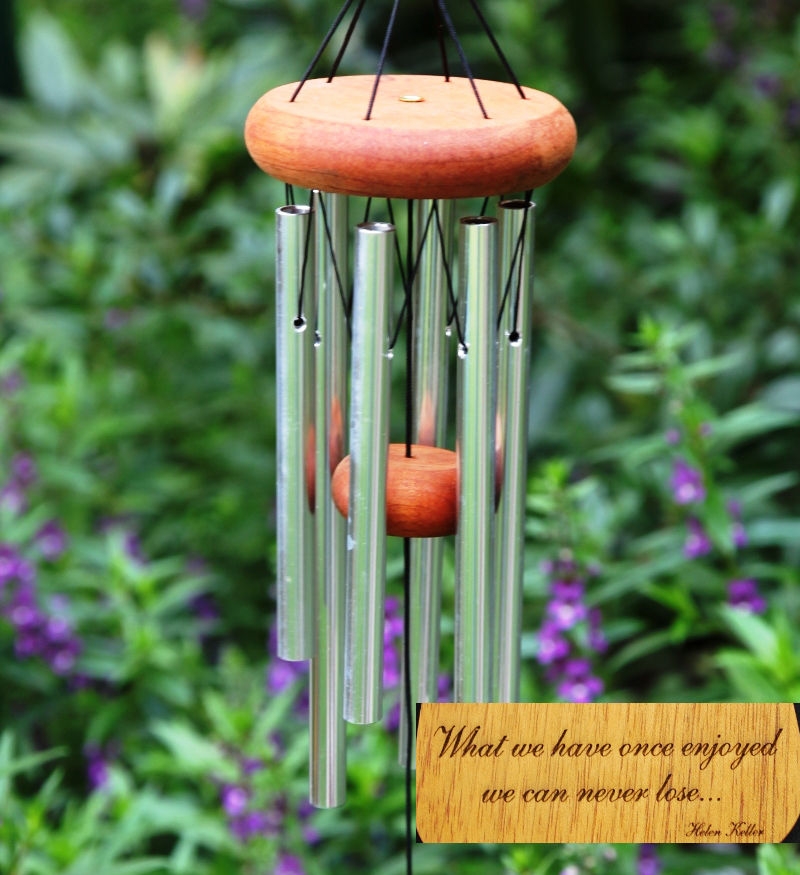The redwood sail is engraved "What we have once enjoyed we can never lose" Helen Keller The In Loving Memory windchime. Made of American redwood, and silver tubes. Hand made in the USA and hand-tuned to pentatonic scales.