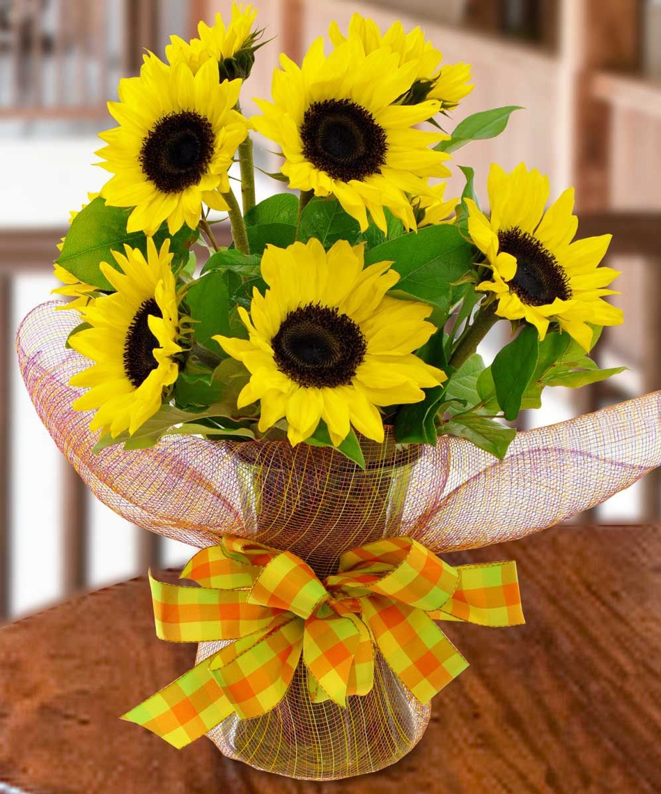A vase filled to the brim with sunflowers DELIVERY: Every order is "Hand Delivered" direct to the recipient. These items will be delivered by us locally, or by a hand selected florist within our team.