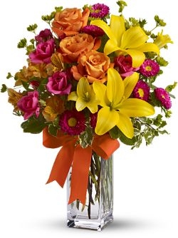 Make a summertime splash with a pop art mix of yellow lilies, set against a jumble of hot pink, orange and green flowers and presented in a modern glass cube vase! This vivid bouquet will bring warm-weather fun to someone’s day. Orange roses and alstroemeria, yellow Asiatic lilies, pink Matsumoto asters, hot pink miniature gerberas and green button spray chrysanthemums – accented with oregonia and solidaster – are delivered in a clear glass vase.