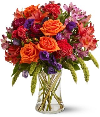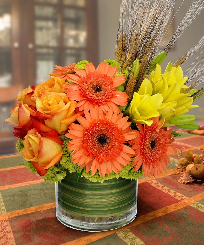 A glass cylinder filled to the brim with Falls harvest. Roses, gerbera daisies, liliest, and black bearded wheat DELIVERY: Every order is "Hand Delivered" direct to the recipient. These items will be delivered by us locally, or by a hand selected florist within our team.