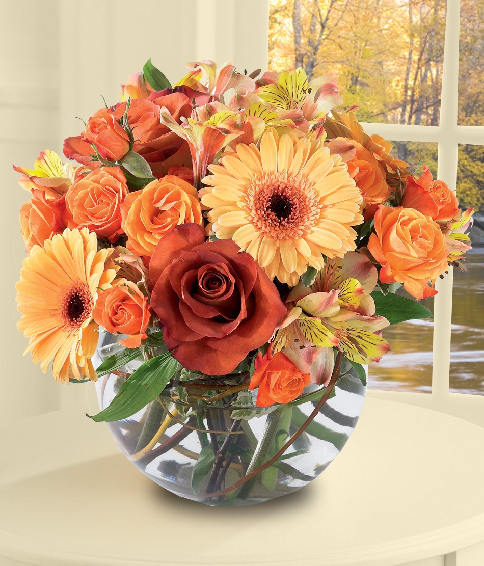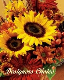 Beautiful assorted autumn flowers fresh cut and designed in a centerpiece or mixed fall arrangement to fit your budget. Our designers will custom design an arrangement with the freshest flowers in stock and at the best value. DELIVERY: Every order is "Hand Delivered" direct to the recipient. These items will be delivered by us locally, or by a hand selected florist within our team. NOTE: Please note centerpiece to include candles or regular design