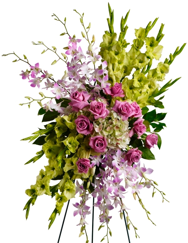 Fresh roses and opulent blooms such as orchids and gladioli – in celestial colors of green, purple and lavender – create a fine floral standing spray. Send this gift of Heavenly Sentiments Spray flowers as a representation of your thoughtfulness and devotion. A standing spray created from fresh flowers such as gladioli, roses, Dendrobium orchids and hydrangea – in shades of green, purple and lavender – is delivered on an easel Approximately 24" (W) x 35" (H) (Dimensions do not include easel.)