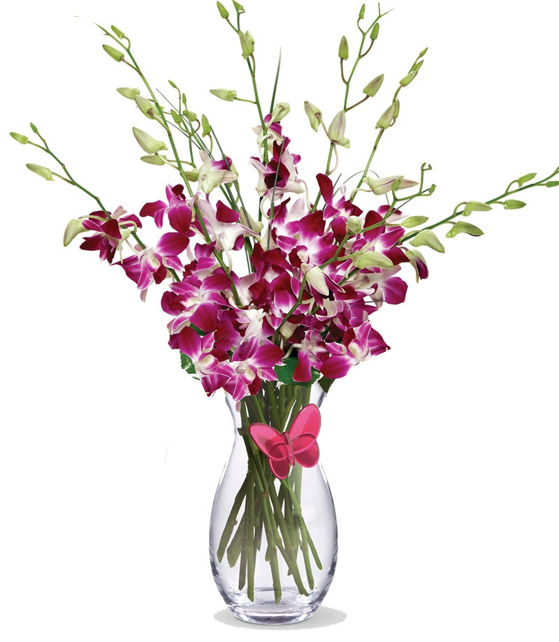 Cute Buttefly Vase Filled To The Brim With Dendrobium Orchids.