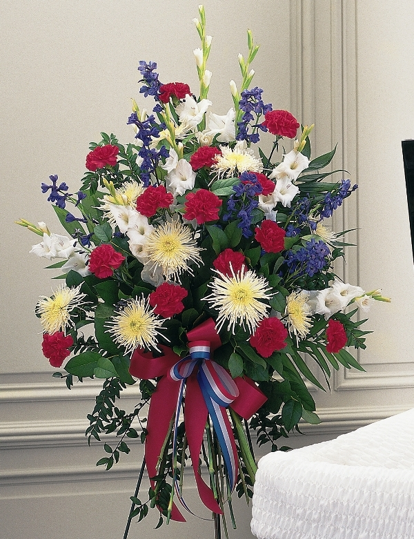 Honor. Respect. Take pride. This striking spray carries a strong message of hope, making it a heartfelt choice in floral deliveries. One standing spray on an easel arrives with red carnations, blue delphinium and white gladioli and a patriotic red, white and blue ribbon. Approximately 32" W x 48" H