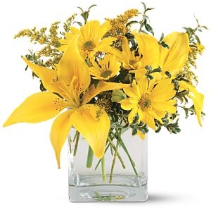 It’s said that just seeing the color yellow can make us smile—so imagine what these gorgeous yellow flowers can do. Go ahead, brighten someone’s day. Asiatic Lilies and Chrysanthemums arranged in a keepsake gift vase. Cube measures 4" H. x 4" W. Arrangement approximately 9" W. x 10" H.