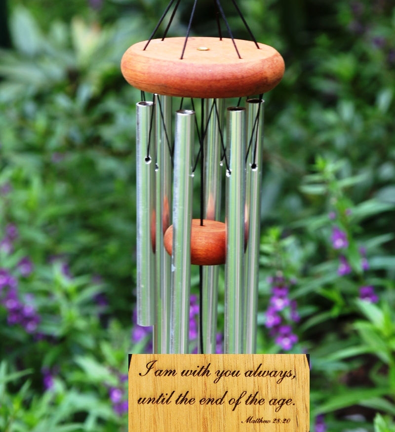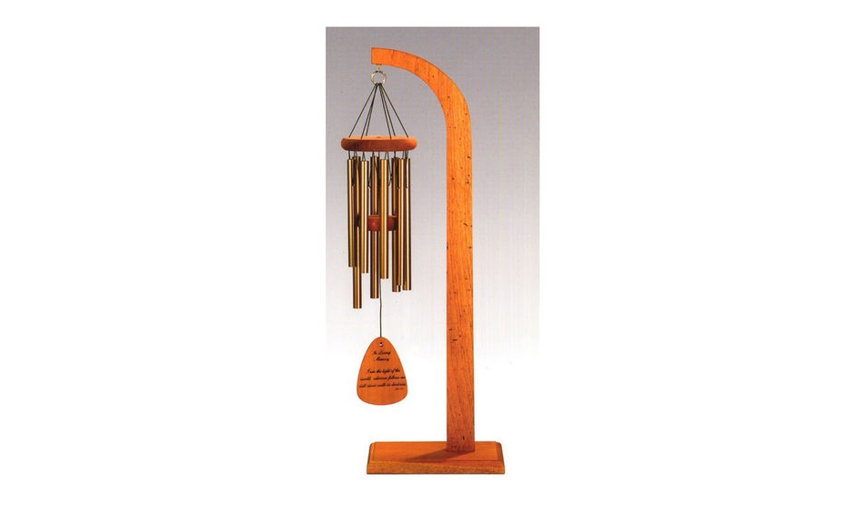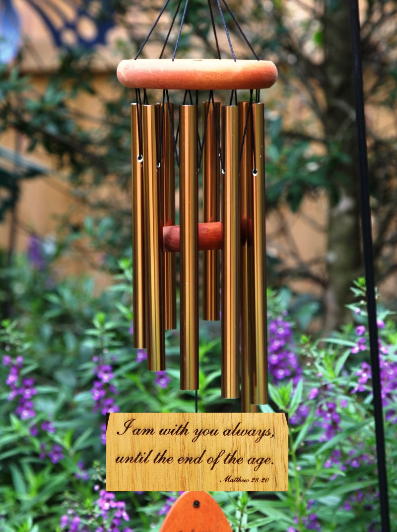 The redwood sail is engraved "I am with you always, until the end of the age" Matthew 28:20 The In Loving Memory windchime. Made of American redwood, and bronze tubes. Hand made in the USA and hand-tuned to pentatonic scales.