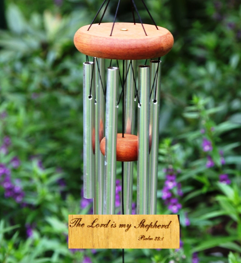 The redwood sail is engraved "The Lord Is My Shepard" Psalm 23:1 The In Loving Memory windchime. Made of American redwood, and silver tubes. Hand made in the USA and hand-tuned to pentatonic scales.