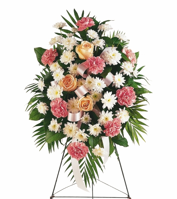 Express your deepest sympathies, and extend a gracious note to a service or memorial, with this soft spray of pink and white blooms surrounded by a frame of elegant greens. One spray of pink carnations, white spray chrysanthemums and rose accents with a pink ribbon is delivered on an easel. Approximately 24" W x 42" H