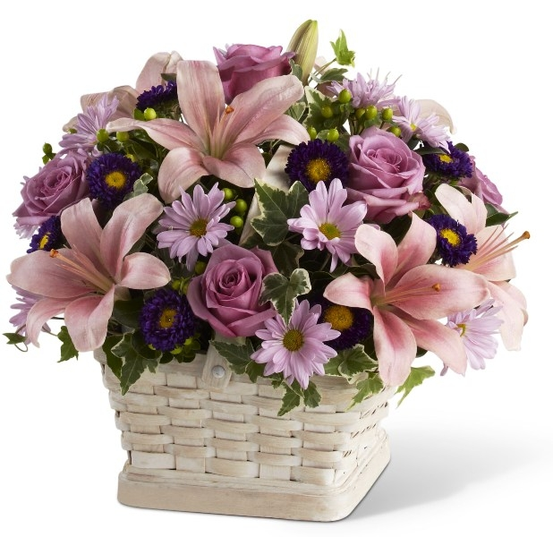 A small and simple basket design filled to the brim with pink lilies, purple daisies, and lavender roses.