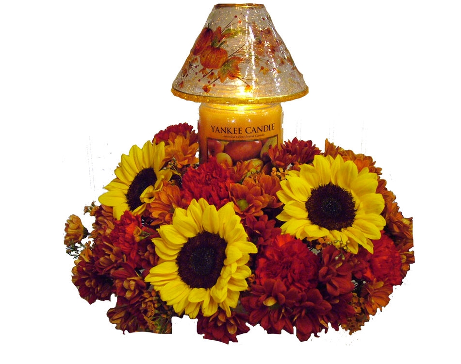 A beautiful autumn arrangement of fresh flowers accented with a Yankee Candle Jar and Mosiac Shade. Scent of Candles & Flower Choice Will Vary Based On Season. DELIVERY: Every order is "Hand Delivered" direct to the recipient. These items will be delivered by us locally, or by a hand selected florist within our team.
