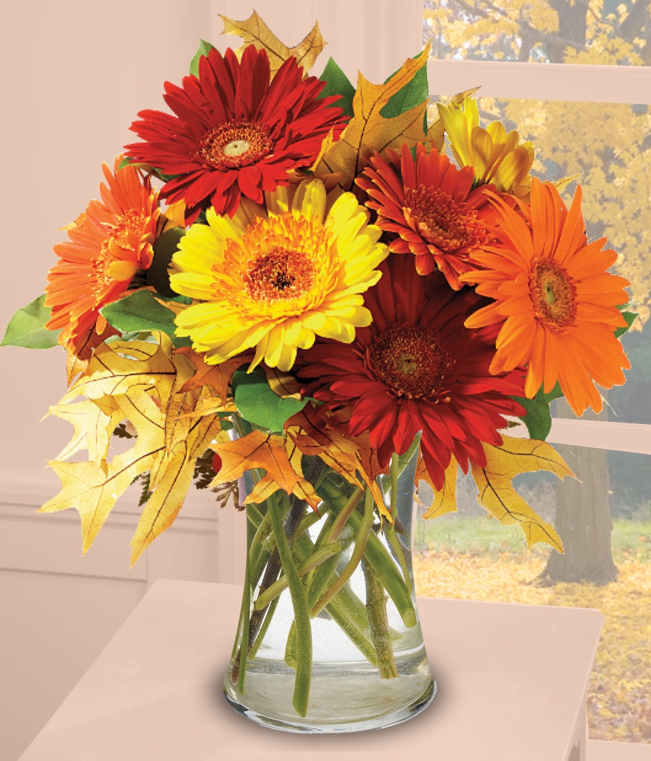 The warmth of the season radiates from this exuberant floral arrangement featuring glorious Gerber Daisies in every color under the autumn sun! DELIVERY: Every order is "Hand Delivered" direct to the recipient. These items will be delivered by us locally, or by a hand selected florist within our team.