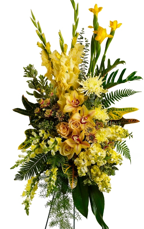 A brilliant burst of blooms in glowing shades of yellow and bronze will bring warm thoughts of a sunny soul that’s departed. This Sunshine Spray flower arrangement – a free-form standing spray delivered on an easel – creates a bright display at any tribute or occasion of remembrance. A standing spray of fresh yellow and bronze flowers such as Cymbidium orchids, iris, gladioli, snapdragons and stock – accented with greenery – is delivered on an easel. Approximately 21" (W) x 37" (H) (Dimensions do not include easel.)