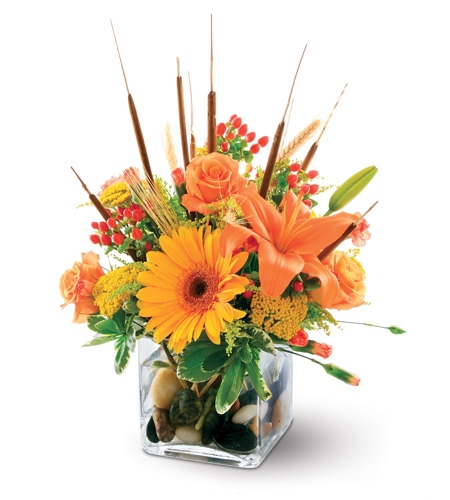 Splash your surroundings with the loveliest colors the Autumn season has to offer when you order this contemporary cube vase with river rocks, gerberas, lilies, wheat harvest, and cat tails. A combination modern artistry and vibrant hues will provide a cheerful attitude to any celebration. DELIVERY: Every order is "Hand Delivered" direct to the recipient. These items will be delivered by us locally, or by a hand selected florist within our team.