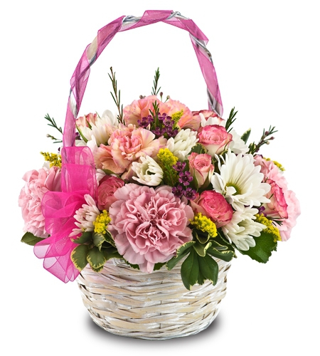 Send your love this Mother's Day with a basket of pink and white spray roses, daisies and carnations, complete with a pretty pink ribbon laced around the handle, leading to a lovely, decorative bow!