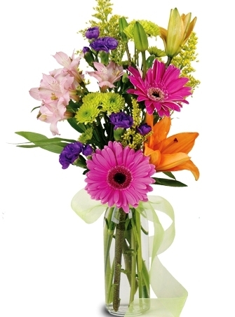 A simple vase of springs finest flowers. The vase has a great mixture of lilies, gerbera daisies, alstromeria, and button chrysanthemums.