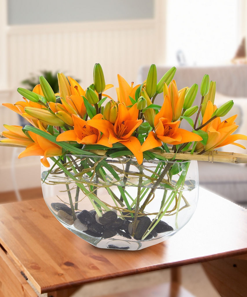 A very unique oblong vase with bamboo and autumn colored lilies. Color of lily may vary. DELIVERY: Every order is "Hand Delivered" direct to the recipient. These items will be delivered by us locally, or by a hand selected florist within our team.