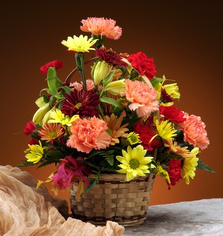 Enjoy the beauty of fresh picked Autumn field flowers including bronze and burgundy daisy mums, red and orange carnations, and fall leaves in a natural wicker or twigg basket. Approximately 12" x 12" DELIVERY: Every order is "Hand Delivered" direct to the recipient. These items will be delivered by us locally, or by a hand selected florist within our team. NOTE: Basket type may vary due to availability.