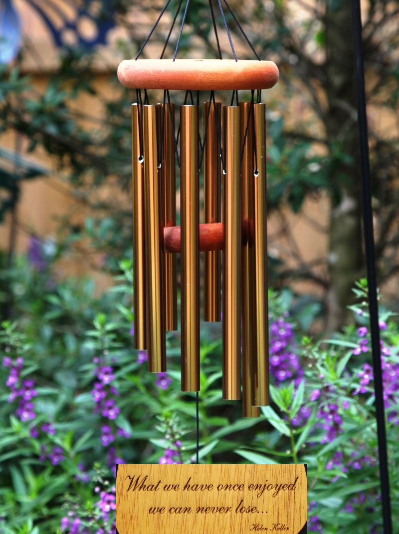 The redwood sail is engraved "What we have once enjoyed we can never lose" Helen Keller The In Loving Memory windchime. Made of American redwood, and has bronze tubes. 24" long, Hand made in the USA and hand-tuned to pentatonic scales.