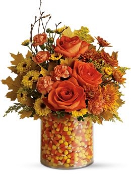 This arrangement with its yellow and orange flowers, and real candy corn, will make someone’s Halloween or Autumn season a little sweeter. Perfect for decorating or just enjoying. Orange roses, bronze chrysanthemums and orange miniature carnations are set in a glass bowl with real candy corn. DELIVERY: Every order is "Hand Delivered" direct to the recipient. These items will be delivered by us locally, or by a hand selected florist within our team.