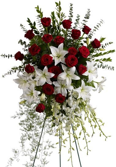 Pure white lilies and Dendrobium orchids mingle with red roses, white Asiatic lilies and more in our Lily and Rose Tribute spray flower arrangement. This magnificent and impressive display of the finest fresh flowers creates a fitting tribute at a funeral, wake or memorial service. A standing spray of red roses, white Dendrobium orchids and Asiatic lilies – accented with greenery – is delivered on an easel. Approximately 22" (W) x 36" (H) (Dimensions do not include easel.)