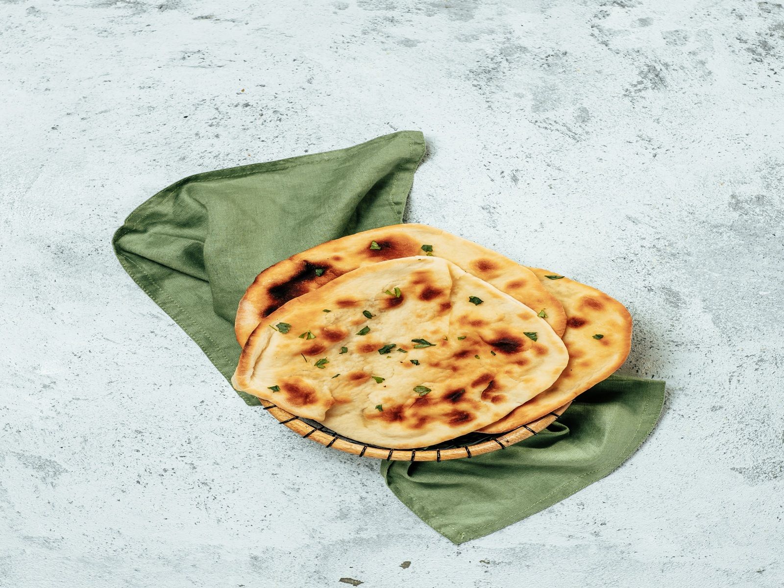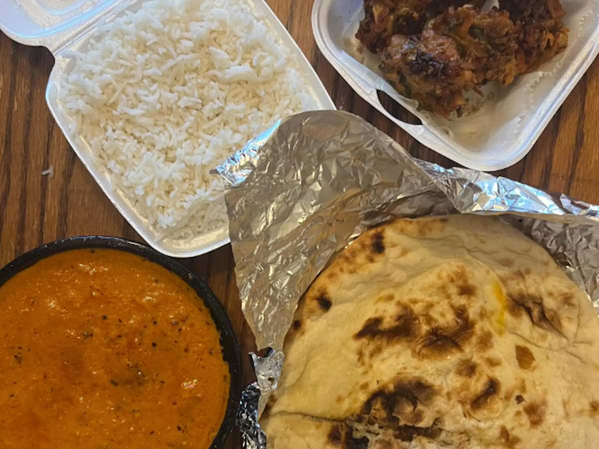 Two meat samosas, choice of three entrees, one butter naan & two garlic naan and two Rusmalai