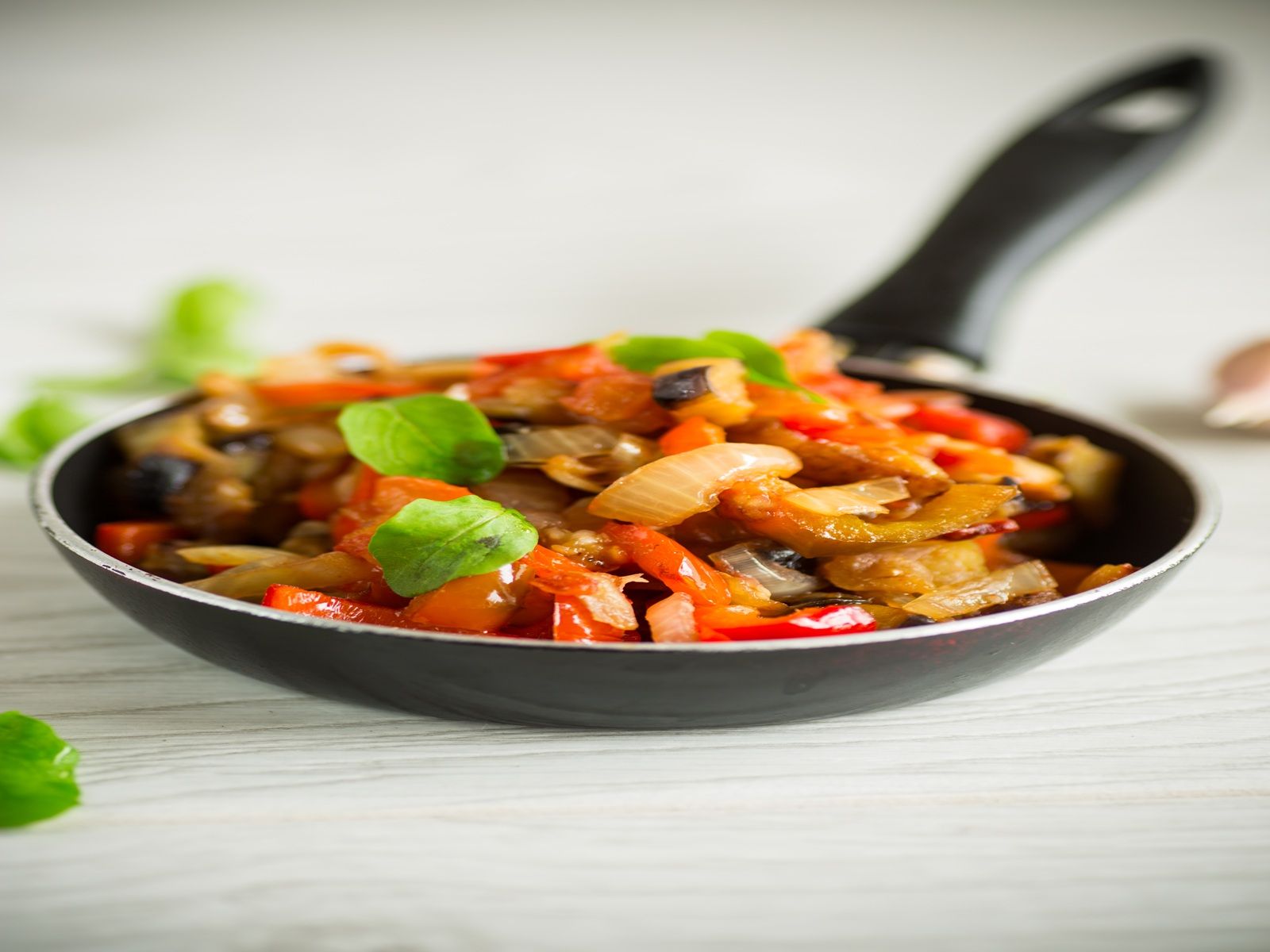 Chick-peas cooked with onions, tomato sauce, and peppers, finished with seasoning.