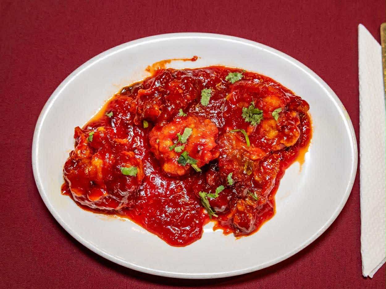 Assorted vegetables small dumplings cooked in a spicy sauce in Indo-Chinese Style.