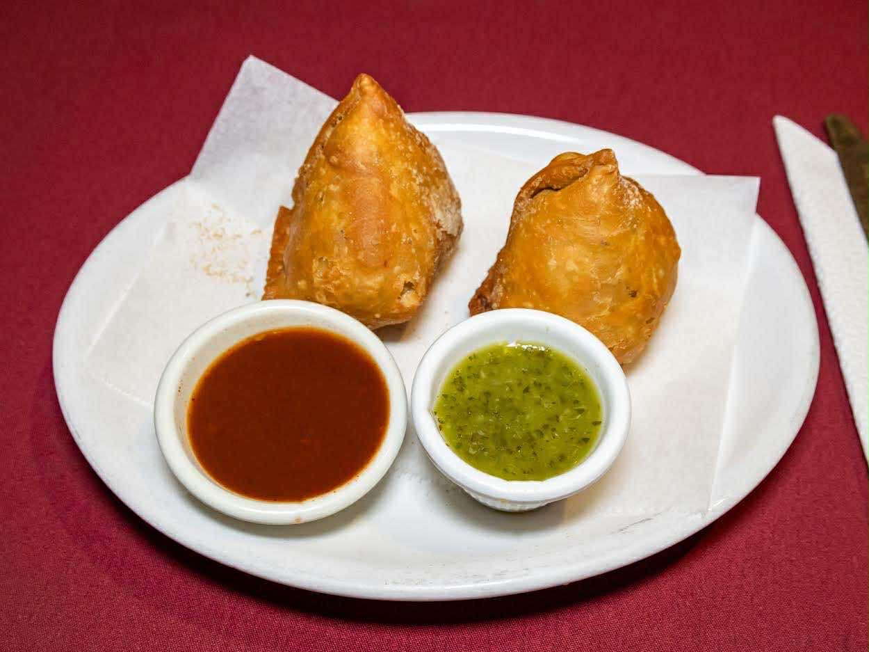 Deep fried crispy turnovers filled with potatoes and green peas.