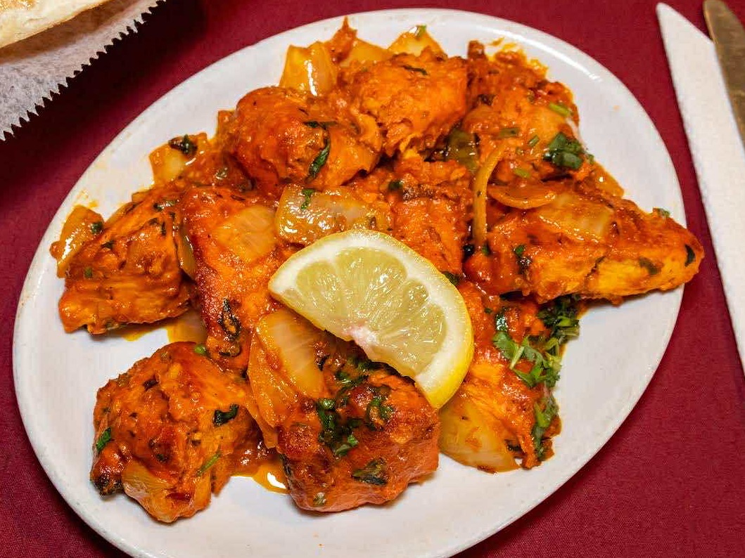 Gently spiced boneless salmon cooked with fresh onions, peppers, tomatoes, and garlic-ginger in Bangladeshi style.