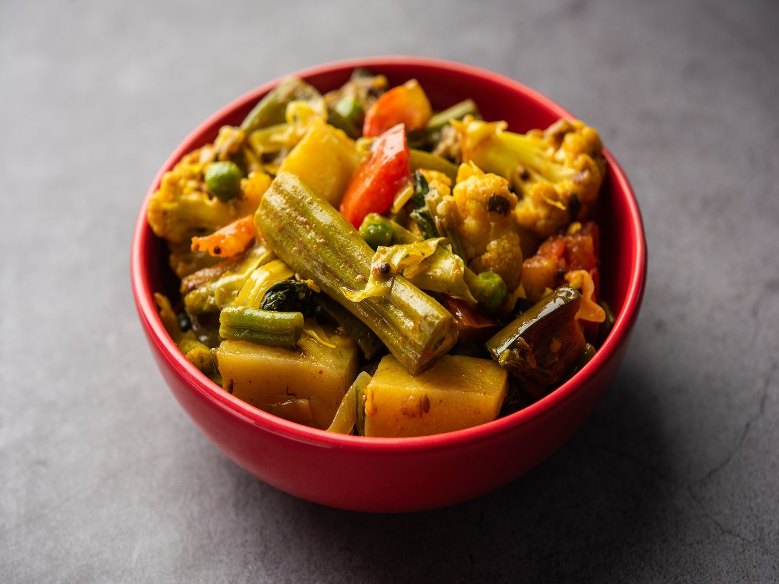 Mixed vegetables (broccoli, cauliflower, squash and potato) cooked in vegetable spicy Rajasthani red chili sauce.