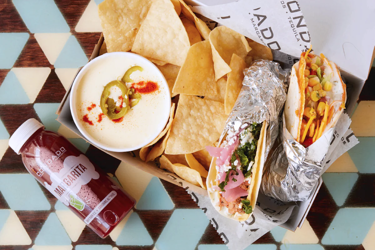 All your Condado favorites together! Choice of two suggestion tacos, Queso Blanco or Traditional Guac, chips + House Margarita to-go. Must be 21 to purchase. A valid ID must be presented upon pickup or delivery.