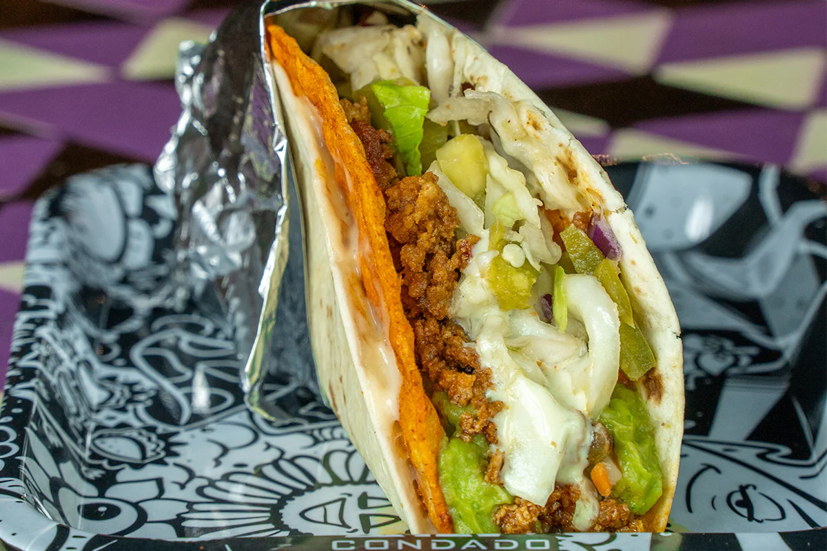 Sweet Lucy shell with veggie chorizo + poblano peppers, lettuce, pico de gallo, pickled jalapenos, smoked cheddar, and dirty sauce | (Veg/D)